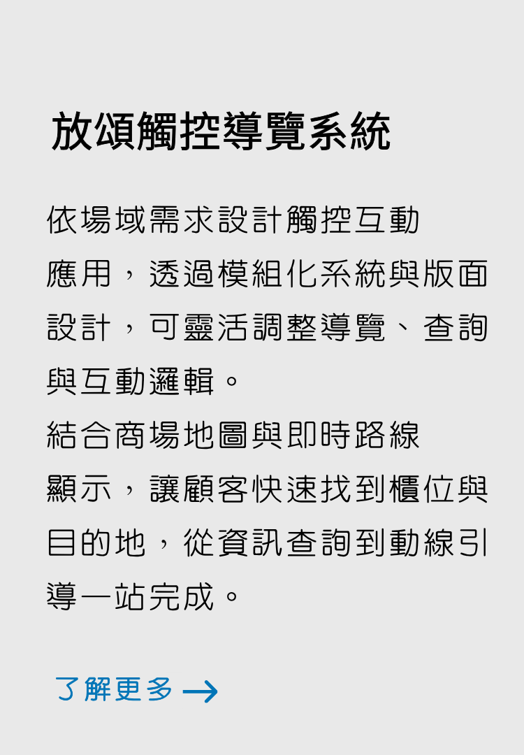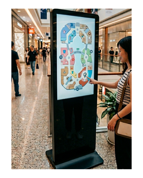 可依商場需求設計操作邏輯與顯示內容,包含活動導引、品牌查詢或特定互動功能,讓系統可隨場域需求彈性延伸