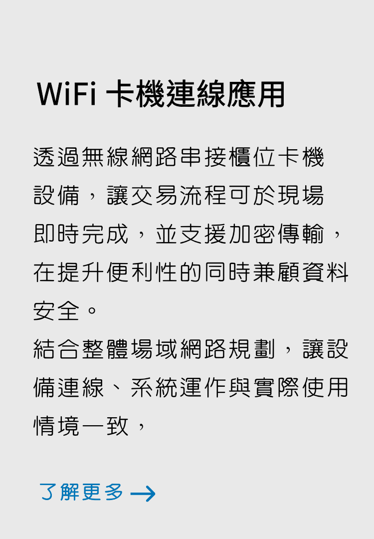 透過無線串接卡機設備,讓刷卡與開立流程可於櫃位直接完成,減少來回處理時間並提升服務效率