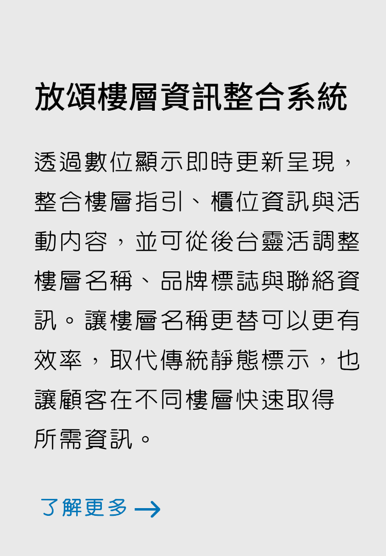 結合數位看板系統統一版面與呈現方式,讓樓層資訊、活動內容與整體空間風格保持一致,在資訊更新同時維持場域質感與品牌形象