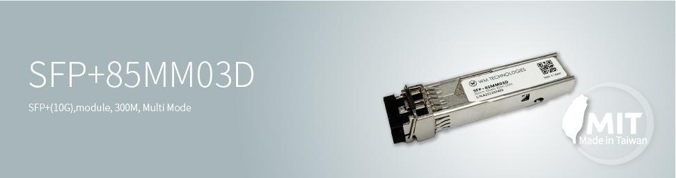 The SFP+85MM03D is a Taiwan-manufactured 10Gbps SFP+ optical transceiver distributed by WM Tech. It operates at an 850 nm wavelength and is designed for short-range multimode fiber transmission, supporting distances of up to 300 meters over OM3 fiber and up to 400 meters over OM4 fiber.