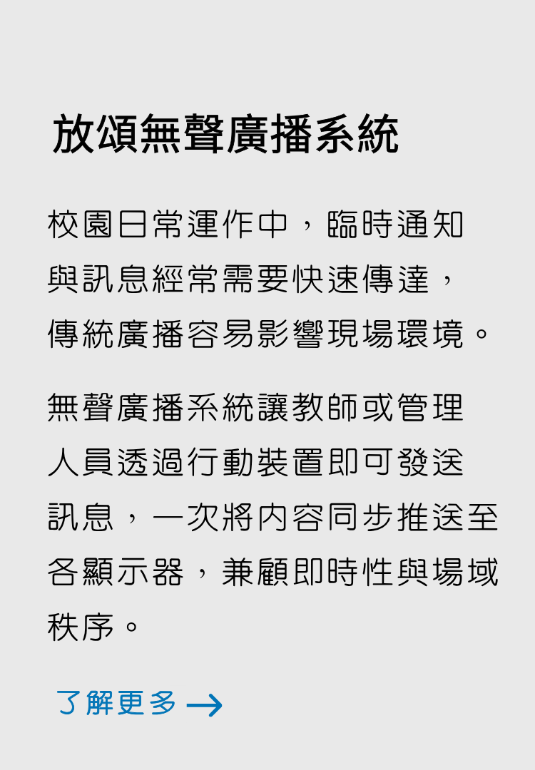以畫面顯示取代聲音廣播,讓老師可以在不干擾教學或現場活動的情況下完成訊息傳達,維持教室內安靜與秩序。