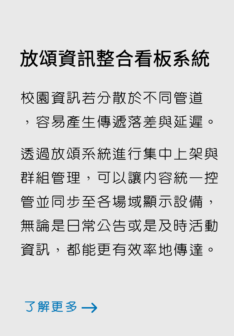 依使用對象與場域需求進行內容群組分類管理,讓不同顯示設備呈現對應資訊,使公告不再一體適用,而是更貼近實際使用情境。