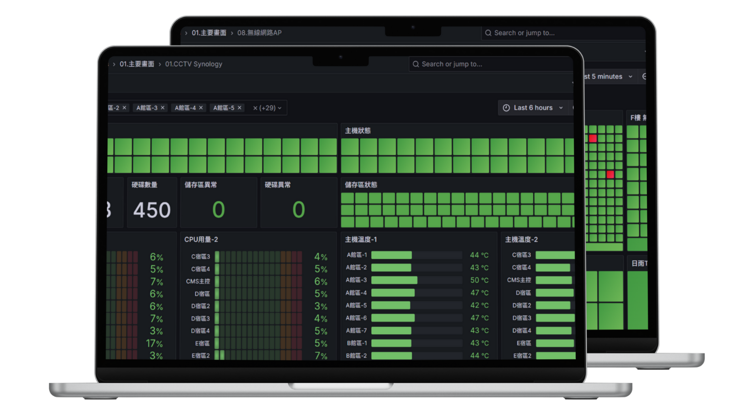 通過直覺式色塊顯示技術,讓用戶快速辨識大量設備的運行狀況,無論是監視器、無線AP設備還是門禁系統,都能在同一畫面中以綠色與紅色顯示其健康狀態