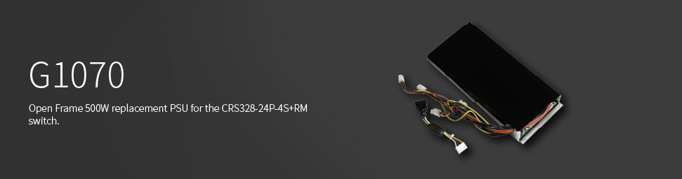 G1070 是專為 MikroTik CRS328-24P-4S+RM 設計的 500W 開放式替換電源,輸入 90–264 VAC,輸出 53 Vdc/8.8 A 或 26.5 Vdc/17.6 A,本體尺寸 284 × 120 × 38 mm。適合機櫃長時穩定運作的企業與機房環境。